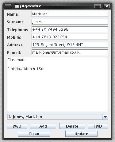To make it work, name the new file “lang.dat” and save it in the same folder where JAgendax is saved. If the program cannot find a file named lang.dat it will run in Spanish by default.